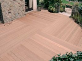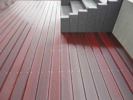 Die Oberbeplankung stellen wir aus Bangkiraidielen (145 mm x 25 mm) her. Verschraubt werden die Dielen mit einer Doppelreihe V2A Schrauben. Somit sind wir uns sicher, daß die Dielen, die sehr stark arbeiten, ein Leben lang ihre Form behalten. Zwischen den Dielen lassen wir immer 4 Millimeter Luft, das sieht zum einen gut aus und zum anderen kann später nichts dazwischen fallen. Wenn wir die Dielen in der Länge stoßen, lassen wir ebenfalls eine konstruktive Fuge von 4 Millimeter. Das war's auch schon. Ich muss nicht betonen, daß wir nicht das Motto haben: "Das ist nur eine Außenterrasse". Für uns bedeutet auch eine Außenterrasse höchste Qualität bis ins kleinste Detail.