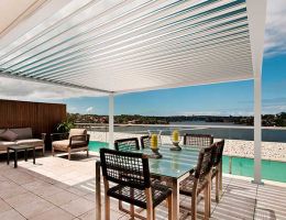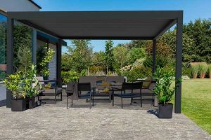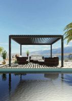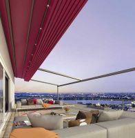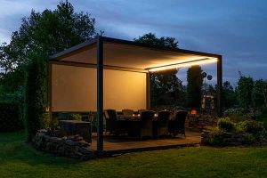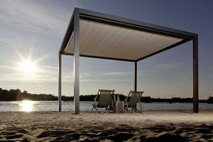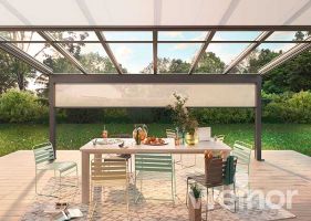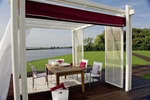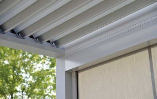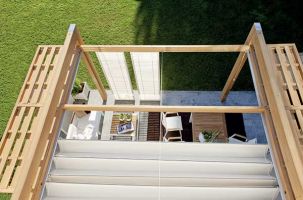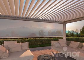 Möglich wird dies durch das Herzstück des clima Q.bus: Das Lamellendach. Durch eine clevere Verstellmechanik lassen sich die Aluminiumlamellen komfortabel motorisiert zwischen 0 und 125 Grad wenden, was zahlreiche Vorteile mit sich bringt. Beim Aufenthalt auf der Terrasse ist so ein ganz individueller Blendschutz möglich. Durch das Öffnen der Lamellen erfolgt zudem eine natürlich Belüftung, so dass keine Hitzestaus unter dem Freisitz zu befürchten sind. Ziehen Wolken auf, schützen die Lamellen im komplett geschlossenen Zustand vor Regen. Und auch der Umkehrfall ist möglich: Wenn ein maximaler Lichteinfall gewünscht ist, beispielsweise in den Wintermonaten, ist auch das durch den sehr großen Verstellbereich der Lamellen problemlos möglich. Optional sorgen seitlich integrierte Senkrechtmarkisen zusätzlich für Sicht- und Sonnenschutz.
